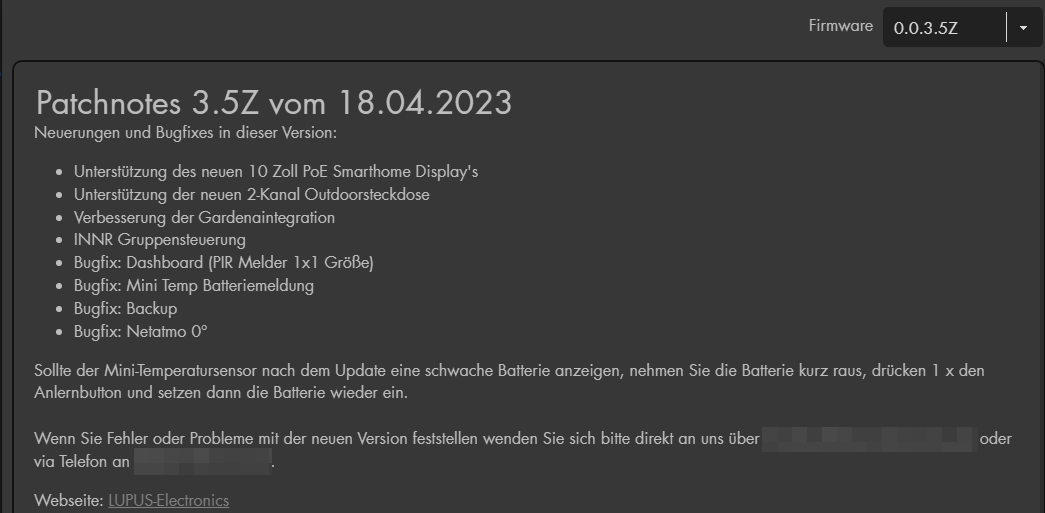 Installation ohne Probleme, auch wurden meine diversen Mini-Temperatursensoren nach dem Update einwandfrei erkannt. Ich musste bei mir keine Batterien entfernen und neu Einsetzen, dies wird für den Fall Vorgeschlagen falls jemand nach dem Update schwache Batterien bei den Mini-Temperatursensoren angezeigt bekommt, siehe dazu auch den Hinweis in den Patchnotes: Schaut gut aus hier bis jetzt. Derzeit keine Probleme, läuft einwandfrei mit der neuen FW 0.0.3.5Z. |