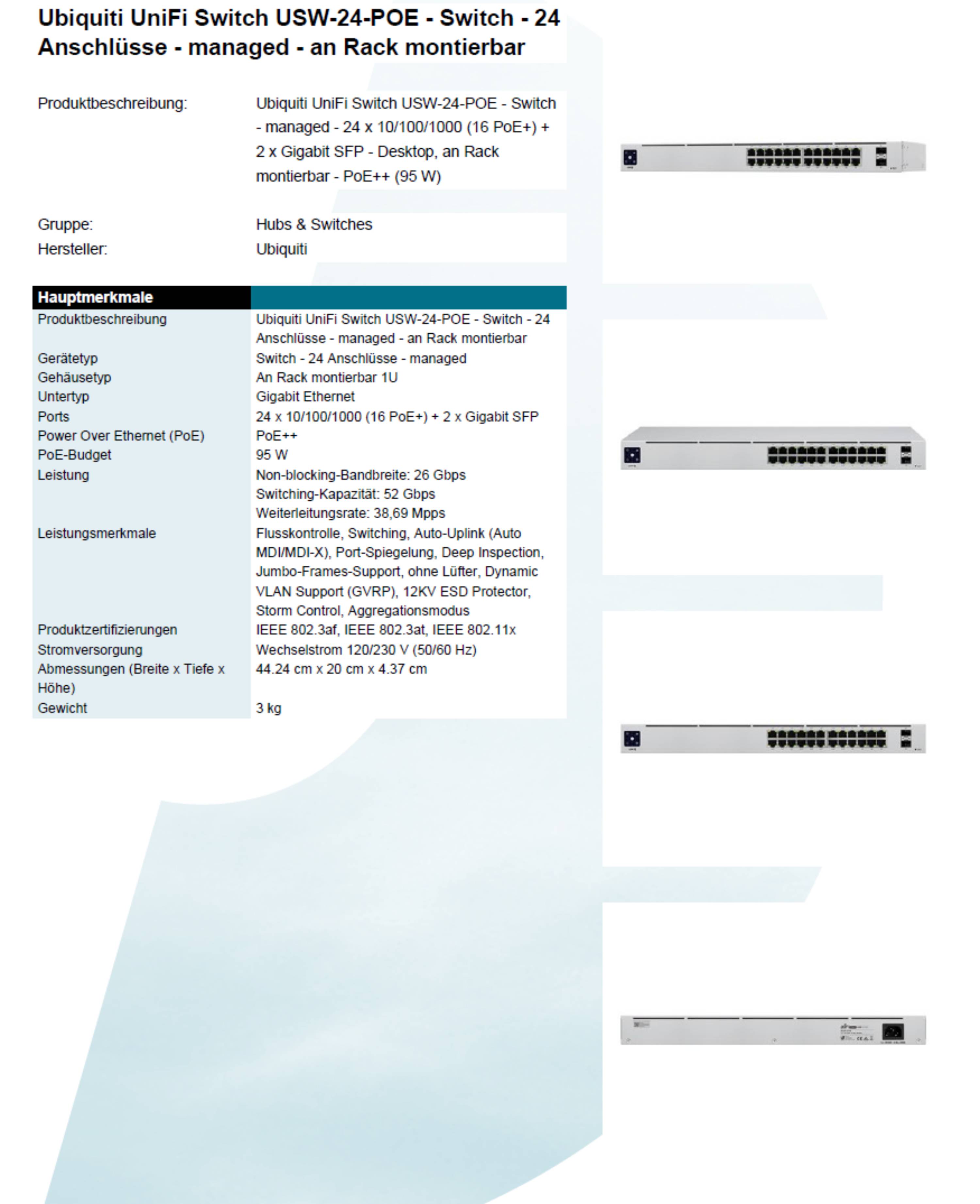 https://www.germanprotect.com/media/mage...era-4k.jpg Die POE-Kameras sollen nur bei Bewegung aufnehmen, mindestens 4K bieten und Nachtsicht. Diesen Switch haben wir schon installiert: Ubiquiti UniFi Switch USW-24-POE - Switch - 24 Anschlüsse - managed - an Rack montierbar |
