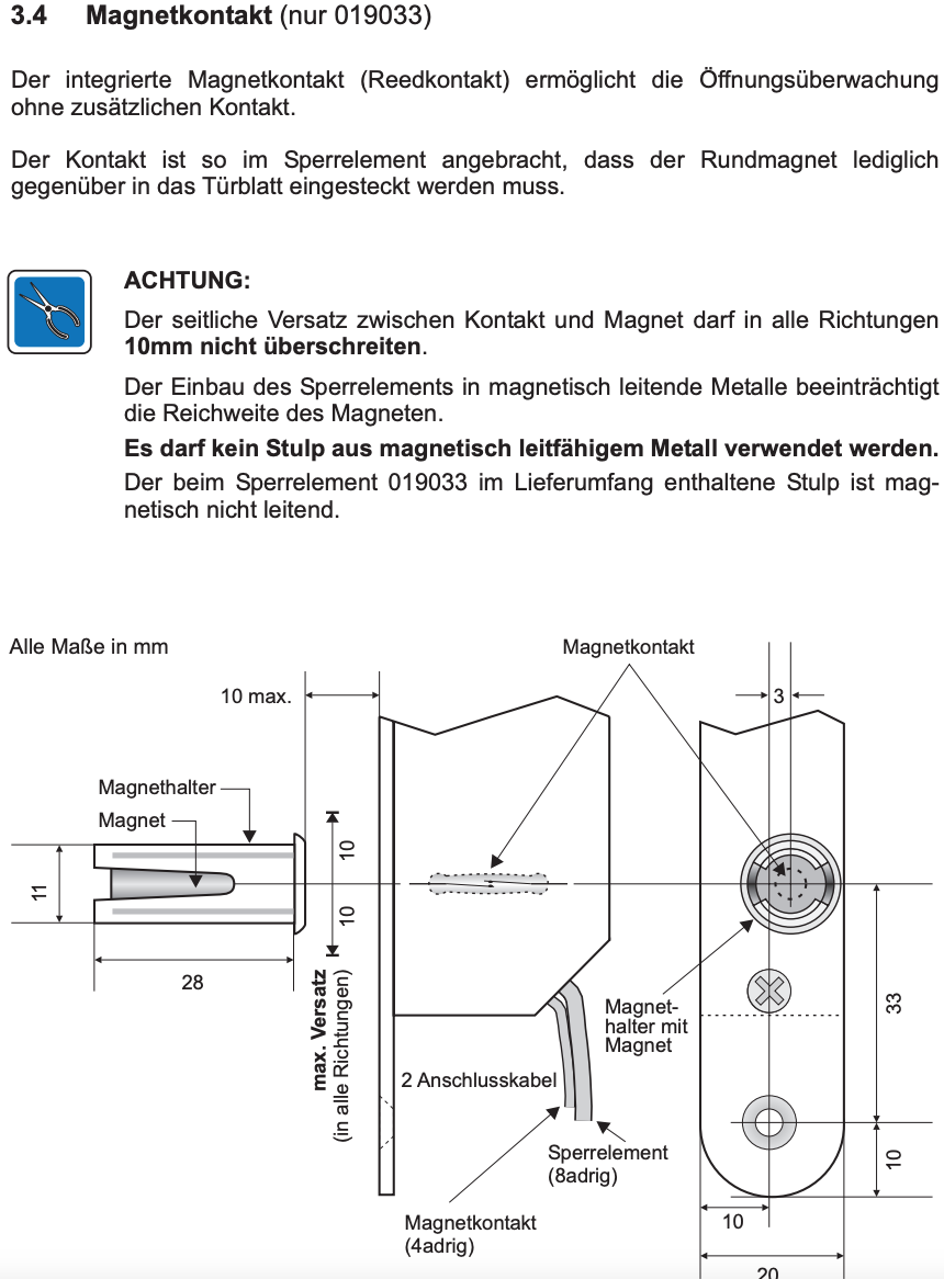 Zum MK: Im 019033 soll ja bereits ein MK eingebaut sein. Im Gegenstück ist allerdings leider nur ein freier Raum (an der Stelle wo der Stulp einfährt). Ich vermute da müsste ich dann einen Magneten integrieren (ich hätte natürlich gedacht er sei da)? Ich könnte die Konfiguration doch auch testen, wenn ich einen externen Magneten in der nähe des Sperrelements halte und dann wegnehme - das sollte doch die Zustandsänderung bewirken? |