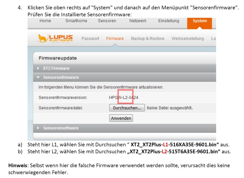 (13-02-2018 19:34)warmup schrieb: Hab mal die Anleitung zur 2.17ZB gelesen (da gab es das letzte Sensorenupdate). Dort hiess es, dass man in der aktuellen Sensorenfirmwareversion schauen soll, ob L1 oder L2 steht und dann das entsprechende bin auswählen soll. beim Firmware-Update vom 09.02.2017 SW 0.0.2.17 war eine Beschreibung in der zip mit enthalten. und hier noch mal die ganze Anleitung zum Sensor-Update aus 2017 (14-02-2018 11:15)warmup schrieb: Hab mir gerade nochmal die 2.19E von Lupus runtergeladen. die beiden Bin-Dateien wurden heute aus der zip entfernt wie man am Datum sehen kann https://www.lupus-electronics.de/shop/Al...#downloads |