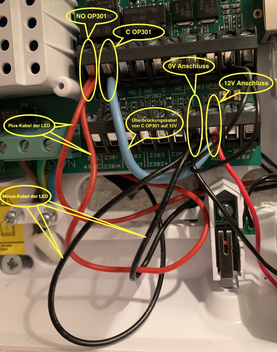 Vorerst ein gutes neues Jahr 2022! Es freut mich, dass dieser Beitrag auf Interesse stösst und helfe gerne mit folgenden Hinweisen bzw. Fotos weiter. Die von Bros beschriebenen Schaltungen sind auf der Platine deiner Hauptzentrale durchzuführen. Bitte lese unbedingt vor einer Mutation die folgenden Zeilen gut durch. Wie schon erwähnt, bin auch ich ein Laie und verweise darauf, dass du jegliche Anpassungen an deiner Zentrale durch einen Fachmann/durch eine Fachfrau durchführen lassen solltest. Selbst durchgeführte Anpassungen erfolgen auf eigenes Risiko. Ich selbst ging für mich das Risiko ein ;-) WICHTIG: Bevor du diese Schaltungen durchführst, ziehe den Stromstecker, so dass die Zentrale Strom los ist und du dich nicht durch einen Stromschlag verletzt. Achte zudem auf eine ausreichende Erdung. Hast du einen Stütz-Akku verbaut, ist dieser vor den Arbeiten ebenfalls zu entfernen. Gehe dazu in den Errichter-Modus, öffne vorsichtig die Front deiner Hauptzentrale und löse vorsichtig den Akku von der Platine. Nun schaue dir die beiden Fotos an. Foto 1 zeigt meine Schaltung ohne Beschriftung auf der Platine der Hauptzentrale. Foto 2 zeigt meine Schaltung mit einer Beschriftung von der Anleitung von Bros. HINWEIS: Bitte beachte, dass die in deiner Hauptzentrale bestehenden Kabelverbindungen beibehalten werden sollen. Mache doch vor einer Änderung ein Foto, damit du diese bei Bedarf wieder rekonstruieren kannst. Meine Verdrahtung ist vermutlich gegenüber deiner etwas erweitert, da ich ein WLAN-Modul eingebaut habe. Lass dich aber davon nicht stören. Wie schon geschrieben, habe ich meine LED-Strips an die zur Wand zeigende Seite der Montageplatte aufgeklebt. Nach der Verkabelung ist noch der Ausgang 301 aktiv zu schalten, siehe dazu Foto 3. Ich hoffe, das hilft dir weiter. Zögere nicht weitere Fragen zu stellen. Viel Erfolg und beste Grüsse C. PS: Da die Fotos nur eine Grösse von 500KB haben dürfen, sind diese leider etwas klein geraten. Ich hoffe dennoch, dass die benötigten Informationen gut ersichtlich sind. |