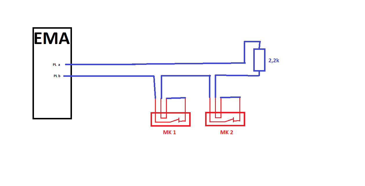 die Sabotage/Alarmlinien der MKs musst du ausmessen. Die Sabotagelinie schleifst du dann ganz einfach in die Alarmlinie ein, wie auf der Zeichnung. Am Ende der Leitung kommt dann der 2,2k Endwiderstand. Was für Kontakte hast du dir den besorgt? VDS-C Kontakte erkennen diese Power-Magneten und lösen aus. |