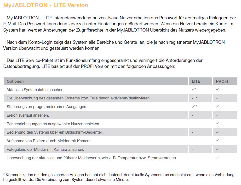 My Jablotron Unterschied Lite und Profi Service