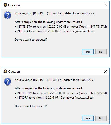 Der einzige Unterschied sind die mitgelieferten gedruckten Handbücher. Die sind bei Bezug aus Polen auch in der entsprechenden Landessprache. Da man sich die bei Satel in deutsch oder englisch beschaffen kann, ist das egal. Es gibt übrigens die Handbücher in allen Sprachen in einer neuen Version 1.05. Nur die deutsche Übersetzung ist noch nicht nachgezogen, die hat noch 1.0.Ansonsten sind es die gleichen Geräte, die man in Deutschland für über 200 EUR mehr kaufen kann. Bin heute einen entscheidenden Schritt weiter gekommen. Ich habe im TSI-Builder folgendes noch mal gemacht: -> Run -> Clean and Build Main Project Dann SD-Karte neu synchronisiert (Karte raus und wieder rein in den Cardreader, TSI erkennt diese und fragt, ob synchronisiert werden soll). Dann habe ich die SD-Karte nochmals synchronisiert. Plötzlich nennt er mir eine höhere Versionsnummer, auf die er updaten will. Erst war es immer nur 1.5.2.2 und nun 1.7.0. SD-Karte in INT-TSI eingelegt und nun läuft das Gerät endlich wieder hoch und zeigt meine Oberfläche (puuh). Jetzt muss ich nur noch die Zentrale neu einrichten und die alte Konfiguration zurückspielen, dass ist mir bisher noch nicht gelungen. Ich bin mir sicher, dass ich Clean and Build vorher auch schon mal gemacht habe, dass kann aber gewesen sein, als ich noch die alte Firmware auf der Zentrale hatte. Die Reihenfolge der Updates scheint einen Einfluss zu haben. Die erste Meldung vom TSI-Builder ist irreführend, denn die Version 1.5.2.2 scheint überhaupt nicht zu den darunter genannten Versionen für STM und Zentrale kompatibel zu sein Satel Integra 64 Plus, alles diskret verdrahtet, kein Funk, 2xINT-TSI, 2xSatel Grey Dual, 6xVD-1, 8xS1, 1xB-3A, INT-VG, ETHM1-Plus, INT-GSM LTE, 2xSPW100, SP-4003. In Betrieb seit 02.01.2016.