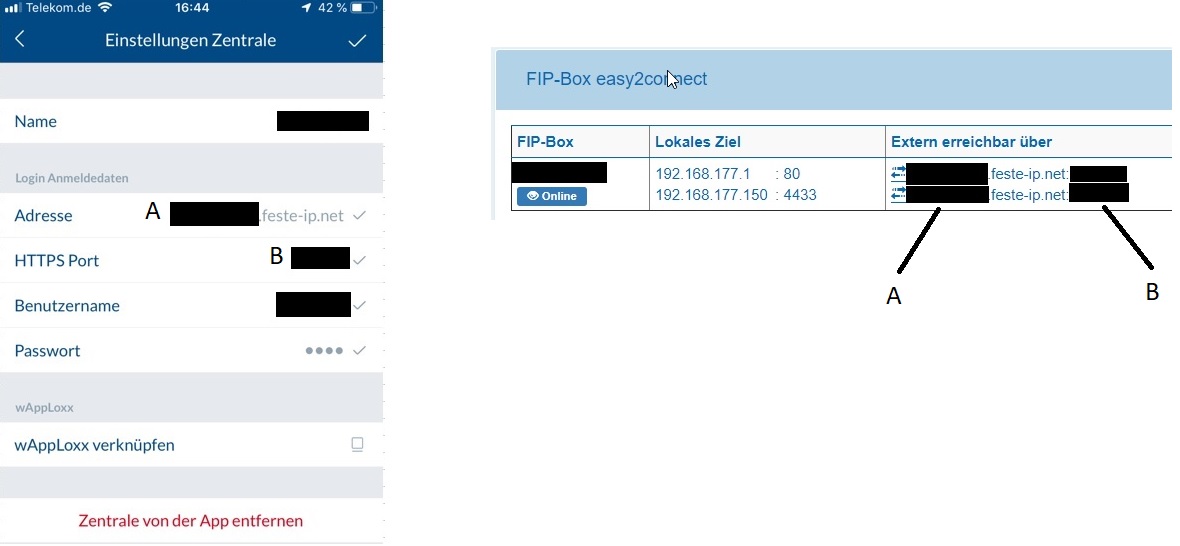 da mir dieses Forum schon ein paar mal gut weitergeholfen hat, möchte auch ich einen Beitrag leisten. Vorwort: ein guter Bekannter möchte in seinem Ferienhaus mit Vodafone LTE Internet (GigaCube) mittels App und Browser auf seine Secvest Alarmanlge zugreifen. Hinweis: die Anleitung gibt meinen Kenntnisstand wieder. Generell empfehle ich aber einen „Profi“ an die Sache ranzulassen. Für die Richtigkeit und volle Funktion übernehme ich keine Haftung! Auch wenn der Beitrag vielleicht als Werbung gesehen werden könnte möchte ich mitteilen, dass ich mit der Firma nichts zu tun habe. Erwähnen möchte ich aber den guten und bezahlbaren Support der Firma Problembeschreibung: diverse Anbieter vergeben bei LTE Verträge keine öffentlichen oder gar feste IP Adressen weshalb der Zugriff von außen nicht möglich ist. Lösung: es gibt Anbieter die Zusatz Geräte/Dienste anbieten. Wie ich das gelöst habe möchte ich euch mit dieser Anleitung zeigen. Was habe ich verwendet / wird benötigt: >>> Fritz Box 6890 LTE >>> FIP Box easy2connect (Feste-IP.net) >>> ausreichende Credits (für ein Jahr kostet es derzeit 20€) >>> einen Account bei Feste-ip.net >>> Portfreigabe Fritz Box >>> konfigurierte Secvest >>> konfigurierten Account bei Feste-IP-net >>> konfigurierte Abus App Einstellungen Fritz Box: Einstellungen Secvest: Einstellungen Feste-IP.net Einstellungen Abus App |