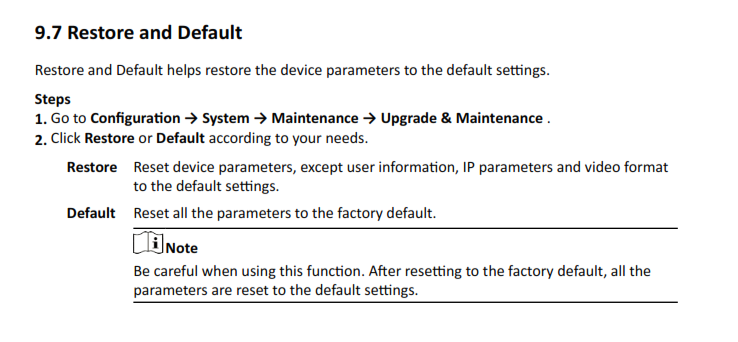 (04-12-2021 20:43)Sandstorm schrieb: 2. wir haben mehrmals einen kompletten Factory redet gemacht, sodass Passwort, Uhrzeit &co. alles wieder neu eingegeben werden muss. Dennoch blieb das Problem. Unser NVR hat im Menü 2 reset Optionen, quasi Mini und komplett. Wir haben immer komplett Reset gemacht. Reset für die Kameras finden wir nicht, unsere haben keinen Knopf und im Tool geht auch nix. Hier ein kleiner Auszug aus dem User Manual (Seite 74) der 2CD-1323G0E-L: Wenn du wie von mir beschrieben mit dem SADP Tool eine Verbindung zur Kamera hast und dich an dieser anmelden kannst, kannst du so einen Reset machen. Die User Manuals für deine Kameras findest du alle mit der Google Suche. Viele Fehler sind RTFM Fehler - Read The Fucking Manual Telenot, Daitem, UTC, Hikvision AxPro, Lupus, AVS www.peteralarm.de |