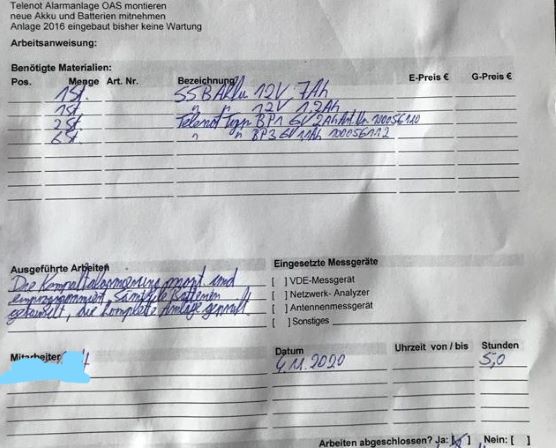 hier die anonymiserten Arbeitszettel für den Abbau und den Aufbau der Aussensirene. Anfahrt ist nicht enthalten und wurde separat berechnet. Als Hintergrund: Compact Easy Anlage mit 5 Fensterkontakten, 2 Bewegungsmeldern und einem Türkontakt, alles im Erdgeschoss und gut erreichbar. Aussensirene im 1. Stock, mit einer normalen 4-m-Leiter gut zu erreichen. Kein Anschluss an eine externe Sicherheitszentrale. Bei der Demontage der Aussensirene wurde zusätzlich EINE Steckdose und EINE Lampe (an der gleichen Hauswand, vom Boden aus erreichbar) demontiert und die Leitungen isoliert. Die auf dem Arbeitszettel angegebenen Arbeitszettel (beide von meiner knapp 80-jährigen Mutter unterschrieben) stimmen vermutlich, zumindest was die Grössenordnung betrifft. Nach ihren Angaben hat der Techniker einen Grossteil der Zeit vor seinem Laptop verbracht, und der beim ersten Besuch anwesende Azubi sass nebendran. Warum dieser Post: Ich wollte einfach nur wissen, ob eine Demontage der Aussensirene wirklich so aufwendig ist. Meine Befürchtung ist, dass die Fachfirma einfach nicht über das nötige Wissen / die nötige Erfahrung verfügt und für solche Arbeiten viel zu lange braucht. Und dass die Firma das dann in Form von branchenunüblichen / deutlich überhöhten Rechnungen an den Endkunden weiterreicht. Mit anderen Worten: Muss man bei einer Telenot-Anlage mit solchen Kosten rechnen, wenn man mal ne Aussensirene temporär abmobtieren muss, oder lohnt es sich, mit dem Fachbetrieb in eine robuste Diskussion einzusteigen, dass ich nicht bereit bin, für fehlende Erfahrung solche Rechnungen zu bezahlen. Vielen Dank nochmal. PS: ich hab zu Hause Jablatron und schon öfters mal Komponenten austauschen, Batterien wechseln oder eine neue Melder hinzufügen lassen. Was normalerweise eine Sache von unter einer Stunde war, davon vielleicht 15-20 Minuten Konfigurationsarbeit vor dem Laptop. |