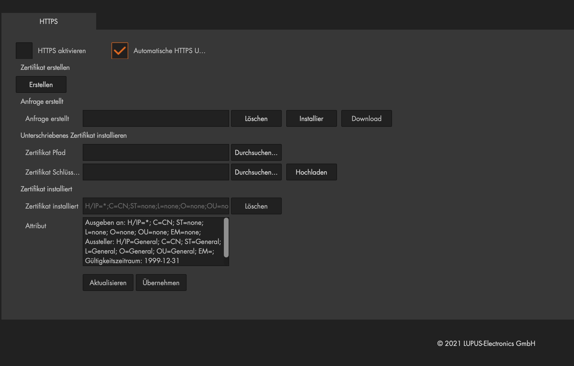 Die Lösung: seit kurzem wird die Verbindung bei der Lupus LE202 verschlüsselt, d.h. das Ganze läuft über HTTPS. Dies wird jedoch wohl noch nicht von von Synology unterstützt, weshalb ich die Kamera nicht bei der Synology Surveillance Station einbinden konnte. Das HTTPS ist standardmäßig nicht so einfach in den Einstellungen zu deaktivieren, aber auch den Trick wie man das umgehen kann, konnte man mir prompt erklären. Also: HTTPS wieder deaktiviert und das Videosignal kommt bei der Synology Surveillance Station an!