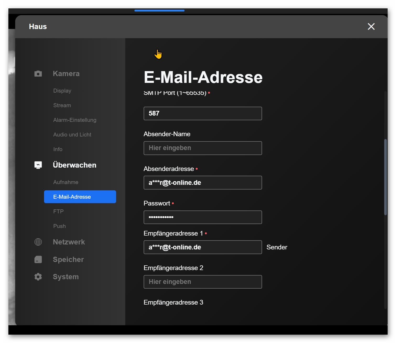 Jetzt möchte ich aber ,wenn ich in der Ferne bin , mein Grundstück über die E-Mail-Adresse überwachen. Neben mir wurde ein Garten zum Parkplatz umgebaut . Da hat nun jeder Zutritt. Möchte aber nur mein Haus von hinten beobachten.