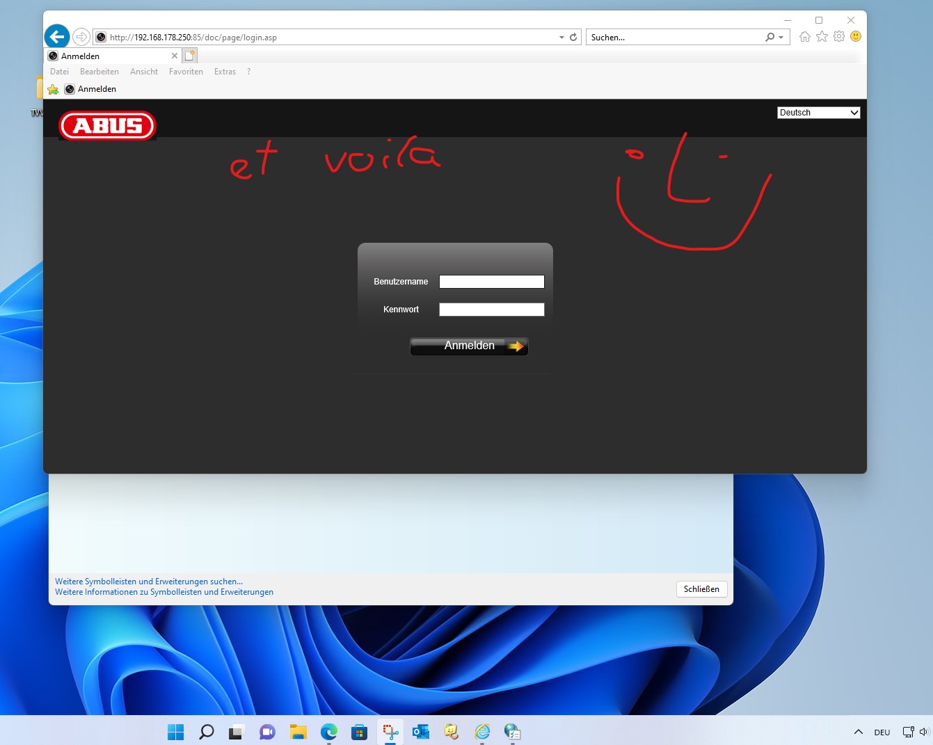 vorab vielen DANK an Cartsen für die Zeit und die Hilfestellung, nach meinem Urlaub habe ich solange gesucht und rumgebastelt bis ich den Abus DVVR 33008 Oberfläche auf meinen Windows 11 64 bit mit dem IE 11 hinbekommen habe, nachdem ich über die I-Net Optionen das IE 11 Add- ons aktiviert habe habe ich zugriff über Windows 11 auf meinen Rekorder TVVR 33008. Es ist eine Notlösung wo man immer über die I-Net Optionen draufkommt aber das ist mir egal somit kann ich nun die Anlage wieder so verwenden ob ich unter Windows 7 oder Windows 8 Arbeiten würde ![]() ![]() I-Net Optionen hier beim Pfeil anklicken und siehe da da iser der IE 11 ![]() Einfacj bei Einstellungen auf Info gehe und man sieht das der IE da ist ![]() danach die IP mit Port des Rekordes eingeben und fertisch ist es ![]() |