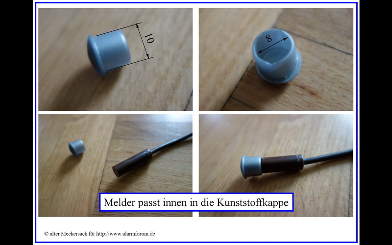 hier ein Tipp von mir, wie man(n) Öffnungsmelder unsichtbar verlegen kann aber diese nicht "fest" einbohrt, Verklebt oder einschlägt sondern auch leicht wieder demontieren kann ... bei mir war es ein ABUS Ein-/Aufbau Öffnungsmelder VdS B braun MK1010B das Ding ist ein Zylinder mit 8 mm Durchmesser ... Vorbereitung: I Bohren 1. 8 mm Bohrung durch Holz 2. 8 mm Bohrung durch Stein, so weiß man muss ... 3. 9 mm Bohrung durch Holz so weit wie der eigentliches Sensor lang ist 4. 10 mm Bohrung ca. 5 mm Tief II Montage 1. ein 8 mm Edelstahlrohr vom Baumarkt in die Bohrung einschlagen, so weit dass das Rohr fest sitzt aber der Sensor noch VOR dem Rohr platz hat 2. Kabel durch das Rohr schieben bis Sensor im Holz verschwindet aber nach "hinten" wegen den Stahlrohr nicht weg kann. => wegen der 9 mm Bohrung liegt der Sensor ganz locker in der Bohrung und würde wieder herausfallen ... 3. eine Kunststoffkappe Durchmesser 10mm aus den Baumarkt, die für die Abdeckung vom Möbel-Schrauben vorgesehen ist von Außen in die Bohrung gedrückt Demontage für Demontage: einfach die Kunststoffkappe mit Korkenzieher oder Schraube herausziehen und den lockeren Sensor aus der Bohrung schieben ...geht gut .. schon probiert ! => man(n) muss etwas nachdenken und messen .. das ganze dauert ca. 1 Stunde ... incl. ein Bier nach jeder Bohrung ... |