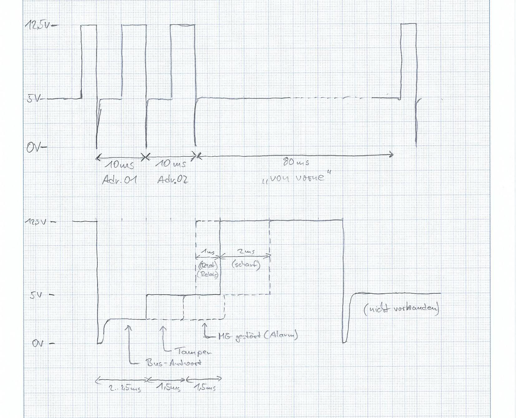 Da ich bisher nirgends irgendwelche näheren Informationen zum Bus-1 (Honeywell und Telenot) finden konnte außer der Tatsache, dass andere auch schon danach gesucht haben und ebenfalls nix gefunden, habe ich gestern einfach mal zum Oszilloskop gegriffen und mir das etwas näher angeschaut.