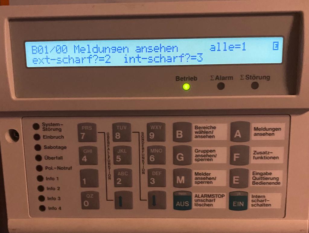 schade . Es sieht wohl so aus, als wäre irgendwas mit der Anlage falsch.Bei Anlegen der B Spannung kamen wie erwartet die Alarme (wie oben). Mit dem Code konnte ich auch den Summer abschalten. Da der Alarm ja wie schon gesagt von "Ik3 Auswerter kam" und die Anlage mir auch angezeigt hat "Alarm nicht löschbar" habe ich daraufhin die Revisionstaste 2-mal betätigt Ebene 5, Ziffern 5, 1, 6, angewählt Gesamt-standartprogramierung angewählt--- Anlage führt Reset aus. Allerdings kamen nach dem Reset die gleichen Meldungen, obwohl in der Standartprogrammierung ja steht "Bus 2 keine Teilnehmer". Auch nach wiederholten Reset (Standartprorgammierung) die gleichen Meldungen (eigentlich als wäre nichts passiert/resetet wurden).Außerdem kamen schon nach dem ersten Reset lauter andere Meldungen(Bilder). Tja ist ja schade :-( Falls noch irgendjemand Nerven übrig hat: Ich wäre immer noch am Start für Hilfe .Ansonsten falls das Ende nahesteht (die Anlage Schrott ist (vielleicht ja auch durch mich)): Tja, dann ist das halt so . War ein Versuch wert, so viel Geld hats dann auch wieder nicht gekostet. Aber ich bin mir wirklich nicht sicher, ob die Anlage jetzt schon kaputt war oder nur mein Wissen darüber (was dann schlussendlich hierzu geführt hat). Ich hab nach Prog Anleitung gearbeitet.Vielen Dank für die Hilfe, ist sehr wissensreich,interessant hier und man lernt immer was Neues (in diesem Fall ...aufjedenfall) .