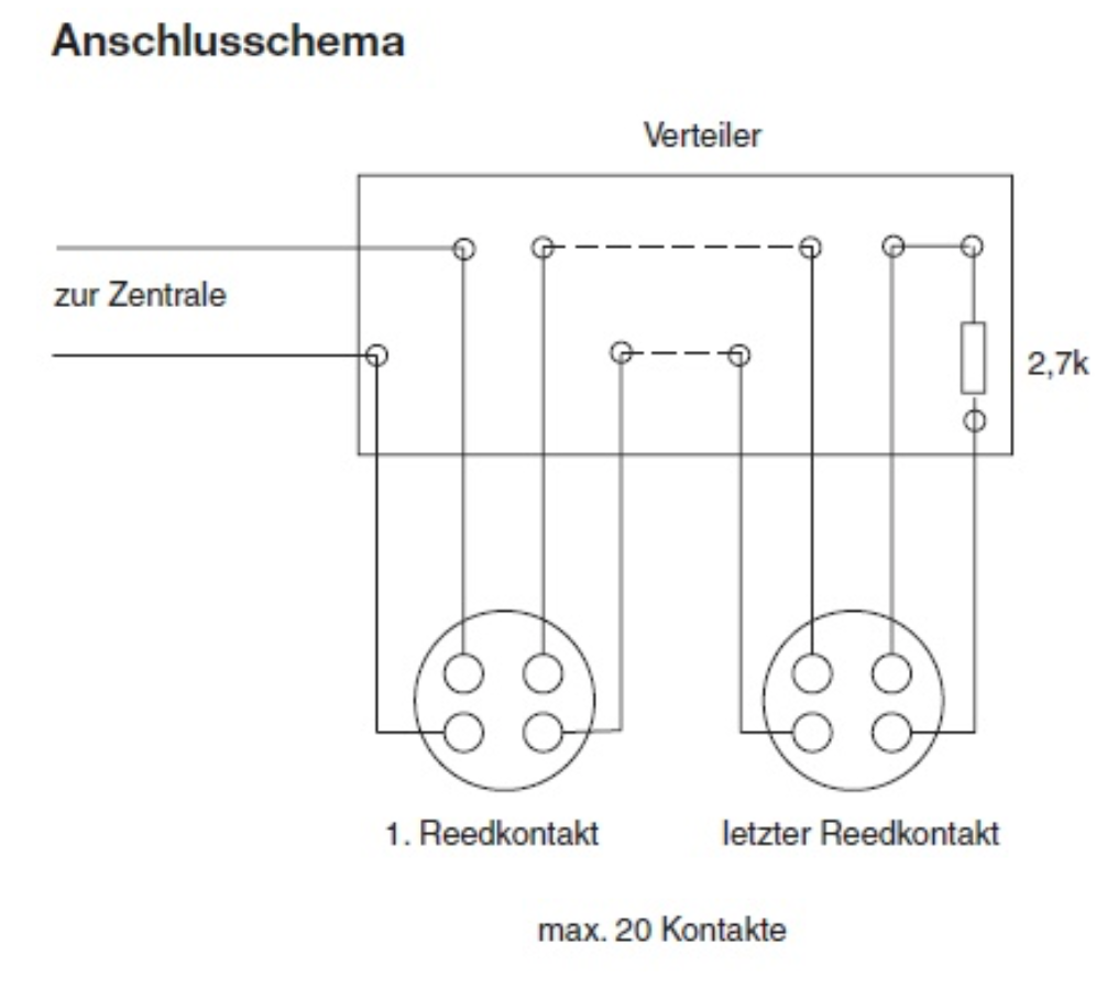 Wenn ich den Fred so lese, möchte ich via MW Belastung im unscharfen Zustand gar nicht informiert werden..." Was wäre denn so ein Nachteil? Die sind doch im unscharfen Zustand sowieso aus, eine Strahlungsbelastung sollte irrelevant sein? Stromverbrauch? Störung anderer Elektronik? "Da wurde in einem Beitrag auch begründet, warum Widerstände in Melder oder Verteiler und nicht in die Zentrale gehören (womit wir wieder beim ursprünglichen Thema wären Wink )" @Martina H. Weißt du zufällig noch, welcher Beitrag das war? Wenn ich mir die Schaltbilder anschaue, zum Beispiel: Dann sehe ich keinen Unterschied zwischen Widerstand in der Zentrale oder in einem Unterverteiler. Die bezeichnen das dort sogar als Verteiler. Klar, im Bereich mit 4 Adern ist es anfälliger als dort, wo nur 2 Adern laufen (theoretisch kann ich die 4 Adern mit einer Brücke lahmlegen, ich muss aber von 6 Optionen die richtige treffen. Die 2 Adern kann ich auch lahmlegen, dann muss ich aber wissen, welcher Widerstand verwendet wird) |