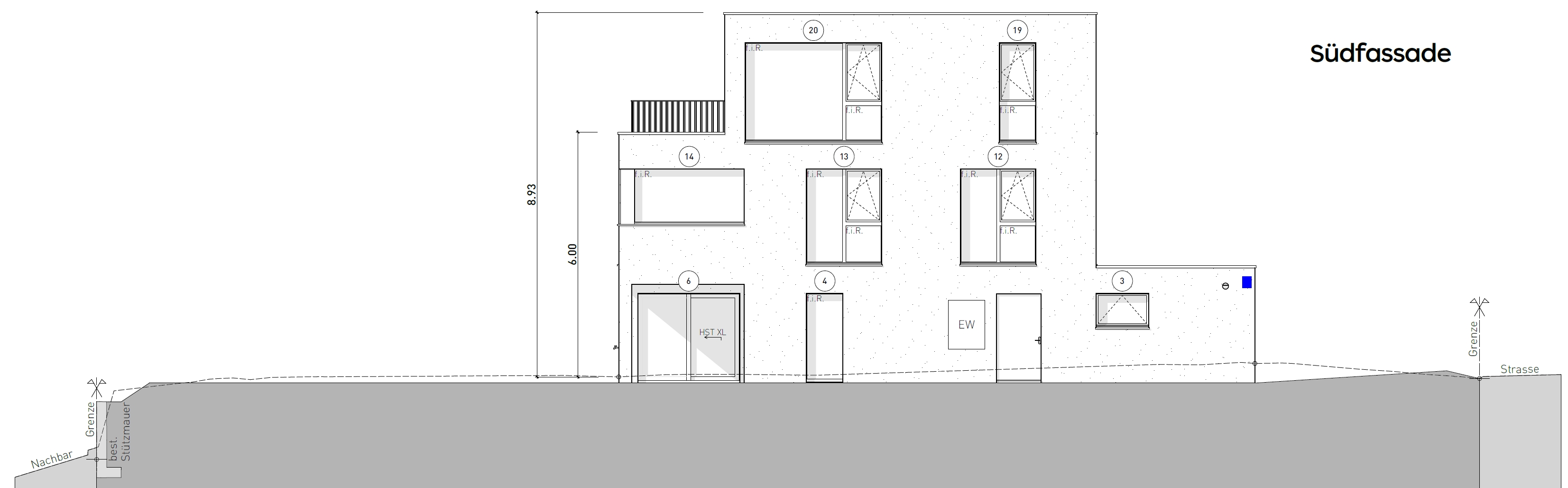 Vorschlag Elektriker Die vom Elektriker vorgeschlagenen Standorte habe ich blau eingezeichnet auf den Zeichnungen der vier Hausseiten: