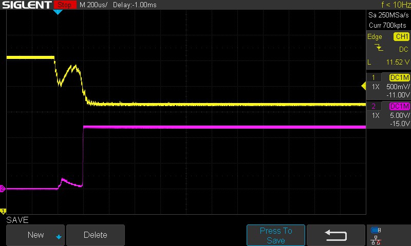 Da ich aber bei beiden gekauften GBM keinerlei Spannungseinbruch beim Auslösevorgang beobachten konnte und ich die gleiche Schließer-Funktionalität wie bei den bereits in der Wand verbauten GBM10 haben wollte, habe ich mir schnell eine Adapterschaltung überlegt. Die Berechnung hat 2min benötigt, die Bauteile kosten ca. 1,50 Euro. Für alle die es interessiert und evtl. anpassen wollen : Stromaufnahme des GBM im Ruhezustand : < 1µA Stromaufnahme des GBM im Alarmzustand (LED an) : ca. 18mA Vorwiderstand in die 12V Seite des GBM : 1V/18mA = 56Ohm Basisvorwiderstand PNP-Transistor : 10kOhm es soll später am Eingang der Alarmanlage 8k2/2k7-Spannungsteiler eingebaut werden, damit der ADC vom Cortex M7 max. 3V sieht mit 10k Basisvorwiderstand führt die Stromüberhöhung zum Durchschalten des Transistors bis zur Sättigungsrestspannung von ca. 0,2V Das Berechnen hat 2min gedauert, das Raussuchen der Teile, Arbeitsplatz einrichten und Aufbauen ca. 1h Die Mechanik (Gehäuse suchen, Öffnungen bohren, Pfosten einkleben, etc.) mehrere Stunden XD Der Meldegruppeneingang wurde mit den 12V verbunden, normalerweise liegen dort die 12V der Meldegruppe an. Habe vorher zum Spaß das ganze noch mal mit LTSpice simuliert und anschließend die Schaltung mit dem Oszi an den gleichen Stellen (am Basisvorwiderstand und am offenen Kollektor) gemessen. Der gelbe Plot ist die Spannung am Basisvorwiderstand und sinkt von 12,1V auf ca. 11,2V ab, der pinke Plot ist auf Ausgang (in diesem Fall offener Kollektor) und geht fast auf die vollen 12,1V die angelegen haben an der Versorgung. Bei anderen Versorgungsströmen kann durch geänderten Vorwiderstand (statt 56 Ohm) dieser leicht angepasst werden. Das Käschtele ist so klein 40mm Kantenlänge, dass ich es in die 50mm Unterputzdose noch unsichtbar verbauen kann