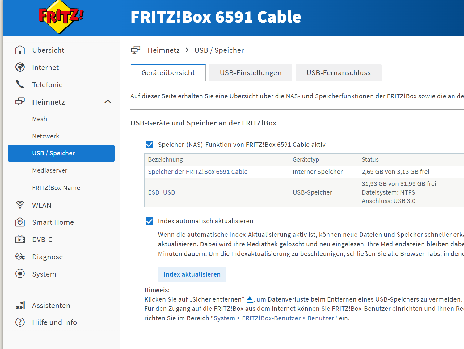 auf der Suche nach einer Lösung habe ich in diesem Forum ein paar Threads genau zum gleichen Problem wie ich es jetzt habe gefunden. Leider steht in den Threads keine Lösung dir mir helfen würde. Ich versuche eine neue HikVision DS-2CD2T87G2H-LI über die Weboberfläche mit meiner Fritzbox 6591 Cable als NAS Speicher einzurichten. Beim einrichten über FTP Menü, bekomme ich jedesmal die Fehlermeldung: Fehler beim Installationsverzeichnis des NAS-Servers; ungültiges Verzeichnis. Mein Setup: In der Fritzbox steckt ein 32GB USB Stick, formatiert mit NTFS. Ich habe einen Benutzer erstellt, der auf diesen Stick Zugriff hat. Der USB Stick hat den Namen ESD_USB. Der Benutzer hat ausschließlich Zugrifsrecht auf diesen USB Stick. Auf dem Stick habe ich Testhalber einen Ordner angelegt "HIKVISION". Ich habe auch als Test dem Fritzbox Benutzer ein Recht gegeben ausschließlich auf diesen HIKVISION Ordner zuzugreifen. Es kommt trotzdem immer wieder die selbe Fehlermeldung. Auch habe ich den ESD_USB und HIKVISION Ordner freigegeben. Auf der Weboberfläche der HIK Cam habe ich unter Netzwerk/Erweiterte Einstellungen/FTP alles erforlgeich einerichtet. Ein Test ist auch erfolgreich. Gehe ich nun auf Speicherung/Speicherverwaltung/Netzlaufwerk/ und gebe da die Fritbox IP Adresse ein und den Dateipfad, bekomme ich die genannte Fehlermeldung. Als Dateipfad habe ich schon probiert: / /ESD_USB /HIKVISION /ESD_USB/HIKVISION In der Fritzbox ist unter Heimnetzfreigabe alles aktiviert. Auch "Unterstützung für SMBv1" ist Testweise aktiviert. Könnte mir damit jemand weiter helfen? Vielen Dank im Voraus Waldemar |