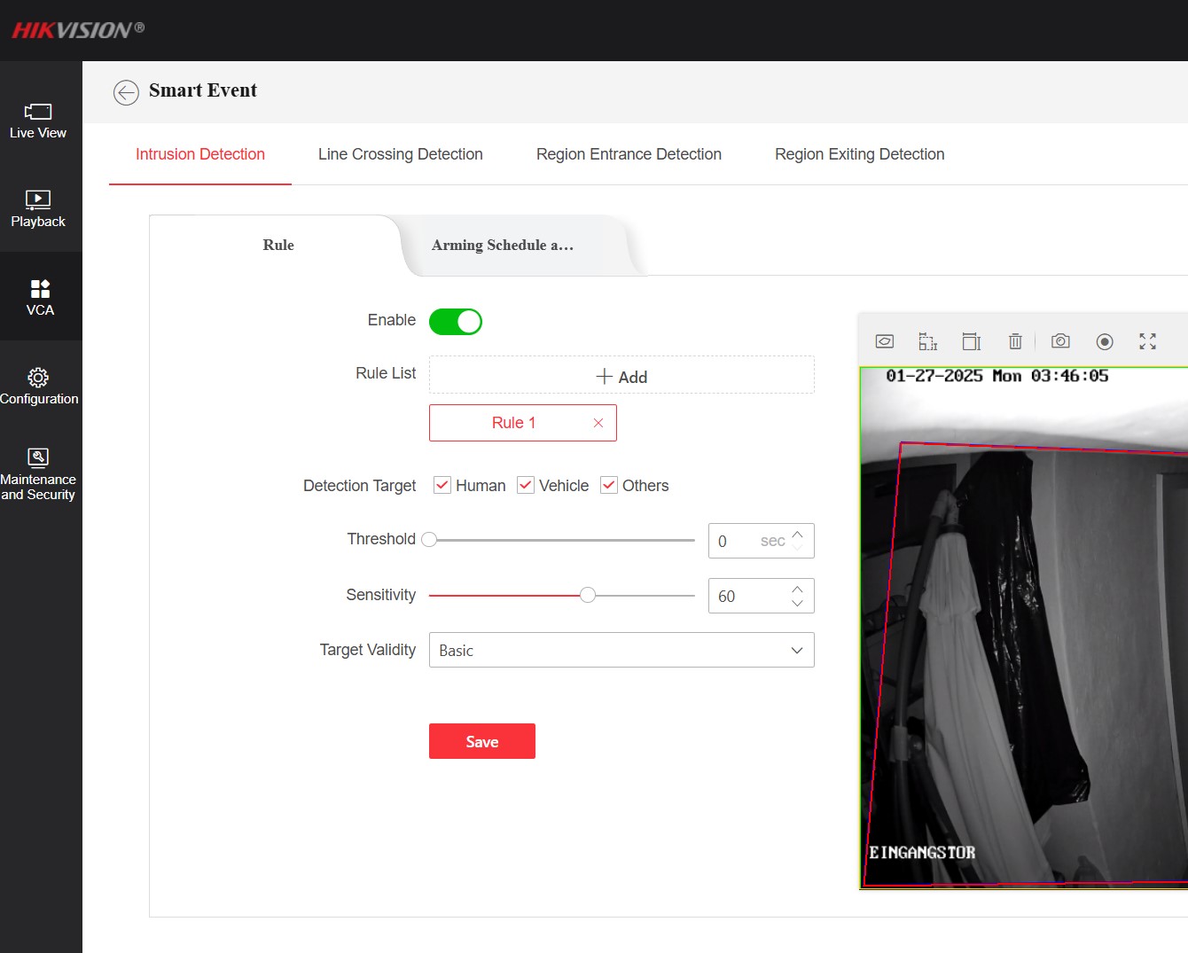 (27-01-2025 00:13)sicherheitstechnik-siegen schrieb: Falls Du diesen Punkt nicht hast, solltest Du überprüfen, ob es sich überhaupt um eine Hik handelt. Hast Du mal versucht die aktuelle Firmware für dieses Modell aufzuspielen? Ja, habe direkt nach Erhalt der Kamera die aktuellste FW bei Hikvision runtergeladen und aufgespielt. Ging problemlos. Den Punkt "Intrusion Detection" habe ich auch. Bei mir schaut das Ganze trotzdem anders aus, der erste Punkt Szenenänderungserkenung taucht bei mir nicht auf, der ist in bei mir einem anderen Untermenü versteckt. Überhaupt, die ganze Oberfläche sieht bei mir anders aus. Hab Dir mal nen Screenshot dazugelegt. Problem-Update: nach Wechsel auf "Intrusion Detection" ist die Verzögerung für Fotos nur noch 2-3 Sekunden, das ist okay. Video wird dafür gar nicht mehr aktiviert, aber da werde ich in den nächsten Tagen noch mal rumspielen... Mit Support meinte ich übrigens die Produktwebsite mit Anleitungen/Firmware-Downloads. Kontakt hatte ich nicht. |
