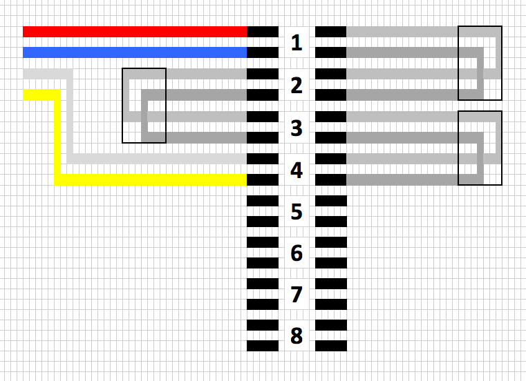 Warum schließt du es denn nicht so an? Das ist der richtige Weg. Anstelle der weiß/gelben Rückleitung kann dort auch der Endwiderstand der Linie angelötet werden. rot/blau ist die Linie der Zentrale. Eine andere Lösung -ohne Brücken wie von dir gewünscht- kann ich mir nicht vorstellen oder ist technisch quatsch.