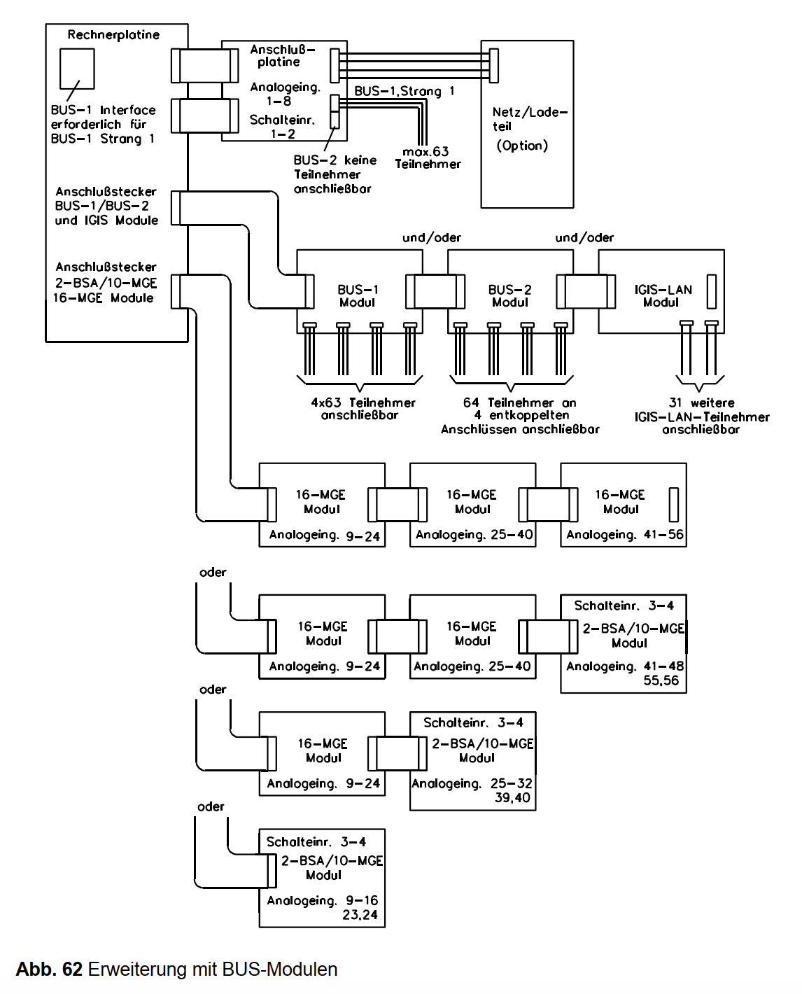 Hast du in der Anlage ein Flachbandkabel, was du dafür nutzen kannst, also zwischen zwei der Erweiterungen, so dass du eine Verbindung zwischen der BUS-2-Erweiterung und CPU hinbekommst? BUS-1 oder ne BSA/MGE brauchst du jetzt erstmal nicht. Wenn nicht, dann zieh das BT ab, steck es auf den BUS-2-Anschluss auf der Anschlusskarte, leg den DIP1 auf Off und bestrome die Anlage einmal neu. Dann solltest du überhaupt eine Regung hinbekommen. Hier mal das Anschlussschema für die Erweiterungen. |