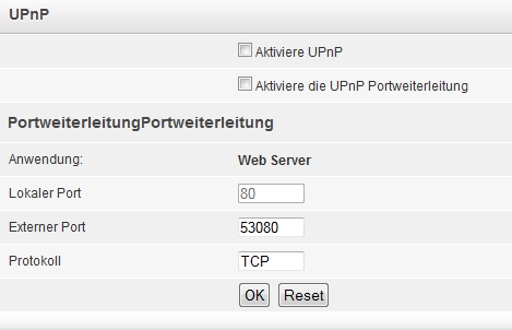 der Externe Standard PORT bei der XT1 ist 53080 unter Webpanel -> Netzwerk -> UPnP kann man dieses einstellen für die Adresszeile im Browser währe das dann: meine.lupus-ddns.de:53080 logischerweise muss der Port im Router 53080 an Port 80 gehen weitergeleitet werden. Mit einer Weiterleitung von 8002 zu 80 geht's so wie es scheint nicht auch wenn man dies unter UPnP einstellt im Webpanel (eben ausprobiert). Wenn UPnP aktiviert und extern Port 53080 sowie intern 80 eingestellt im Webpanel dann braucht man auch bloß im Router UPnP aktivieren ohne eine extra Portfreigabe zu erstellen. |