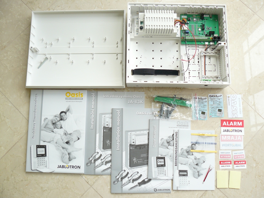 Nachdem mich das selbst auch interessiert hat und ich das eine oder andere Mal hier im Forum oder bei den Distributiren direkt nachgefragt habe möchte euch mal zeigen, was so alles mit den Komponenten mitkommt (Schrauben, Dübeln, Beschreibung, ... ) - quasi ein 'unboxing". ![]() 1x JA-83K Jablotron OASIS Hybrid Alarmzentrale 1x JA-82R Funkmodul 1x JA-82Y GSM-Kommunikationsmodul 1x NPA-12/12 Panasonic Notstrom Akku 2x JA-81E Drahtgebundenes Bedienteil 3x JA-81M Funk-Melder, weiß 9x MK 1010W Magnetkontakt drahtgebunden 4m 10x RFID Chips Transponder 2x RC-82 Jablotron Funk-Fernbedienung 1x JA-82T PC-USB-Schnittstelle Gesendet von meinem Taschenrechner |