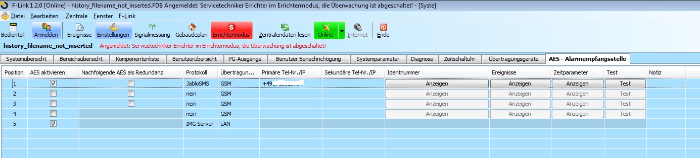 Habe die Einstellungen angefügt. M.M. sollte so alles richtig sein. Zentrale ist aktiviert. AES ist aktiviert mit meiner Handynummer (vorerst zum Test). Der (Test)versand von SMS funktioniert leider auch nicht. |