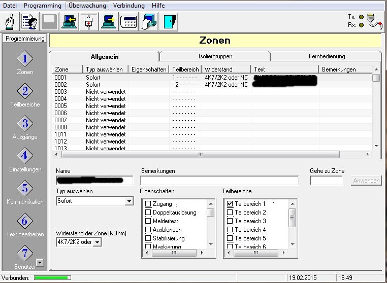 Hattnun einige Benutzer angelegt, Errichter und Administrator, Chips, díe nur Teilbereich 1 (gleichzeitig alles, was auf Zone 1 angeschlossen ist) und Chips, die Teilbereich 2 (gleichzeitig alles, was auf Zone 2 angeschlossen ist) de-/aktivieren dürfen. Das funktioniert in Teilen. Wenn ich nun einen Chip vor das bedienteil halte und mit Enter bestätige, wird der Teilbereich aktiviert, aber ein Sirenenartiges Piepen startet und hört nicht mehr auf (tippe mal die Aktivierungszeit muss geändert werden, aber dann müsste eigentlich ein Countdown laufen) Wenn ich dann in den Melder gehe, die Zone quasi geöffnet wird, wird auch kein Alarm ausgelöst. Das war bei der Terxon S einfacher. Ich muss hier sicherlich Zuweisungen machen, aber lt. Downloader sind die da.