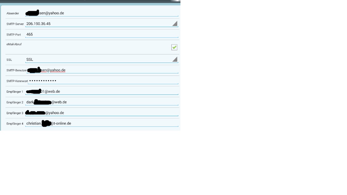 Mit welchem Browser programmierst du das Teil. Nimm mal IE im Kompatibilitätsmodus. Es gibt chinesisches Material, das kann nix anderes. Also hatte gerade mal Zeit, weil ich beim programmieren eines anderen chinesischen Scheisshaufens ähnliches bemerkt habe. 1. dein smtp stimmt nicht. smtp.mail.yahoo.com (SSL; Port 465) in der Beschreibung steht explizit: sie müssen in ihrem Account TLS und die Verschlüsselung freigeben. Du hattest am shot yahoo.de eingegeben. 2. ebenso bei Google Postausgangsserver: smtp.gmail.com (SSL; Port 465 oder 587) Benutzername: Benutzername@gmail.com Besonderheiten: Verwendet SMTP-Authentifizierung. Sie müssen in Ihrem Account den POP3- und SMTP-Zugriff zunächst aktivieren. POP3, IMAP und SMTP laufen über SSL-Verschlüsselung. |