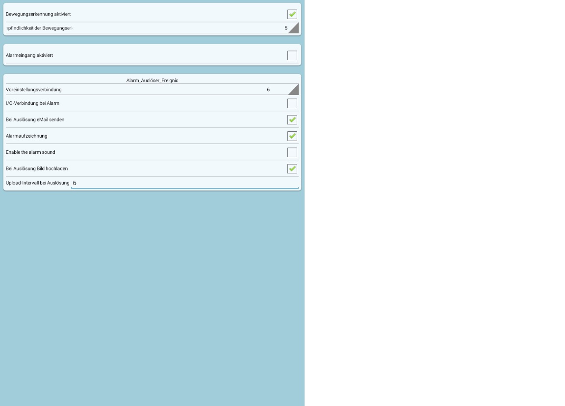 Hab mal ein Shot von den Alarmeinstellungen gemacht. hab das Upload Intervall auf 6 gestellt, mal gucken was da passiert. Im Browser hat mehr noch einige Einstellungen mehr. Jedenfalls kann man dort auch die zeit einstellen in sekunden mit Fotos machen. FTP hat die Kamera auch aber ich habe ja keinen FTP Server also kann ich die Funktion auch nicht benutzen! |