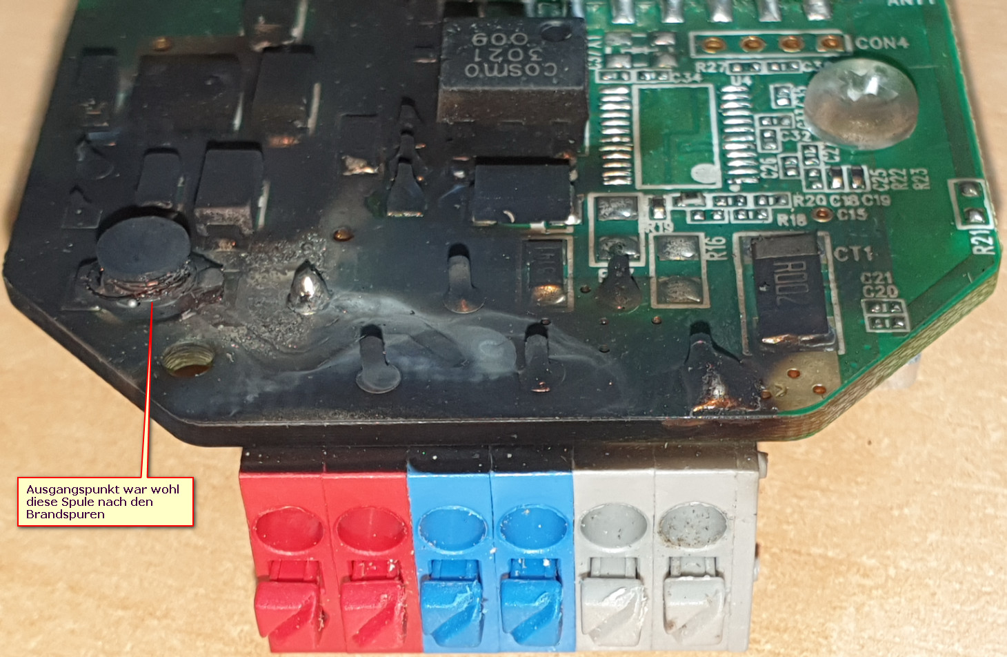 Unterputzrelais ausgebaut, Anschlüsse intakt ohne Auffälligkeiten.