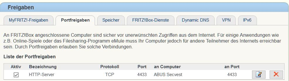 Die Anlage hat eine statische IP mit Port 80, dies wird auch im Speedport i.o. erkannt. Ich habe eine Portweiterleitung eingerichtet auf die 4433-4433 4433-4433 und auch den Port 4433 in der Alarmzentrale unter dem Abus server eingetragen.