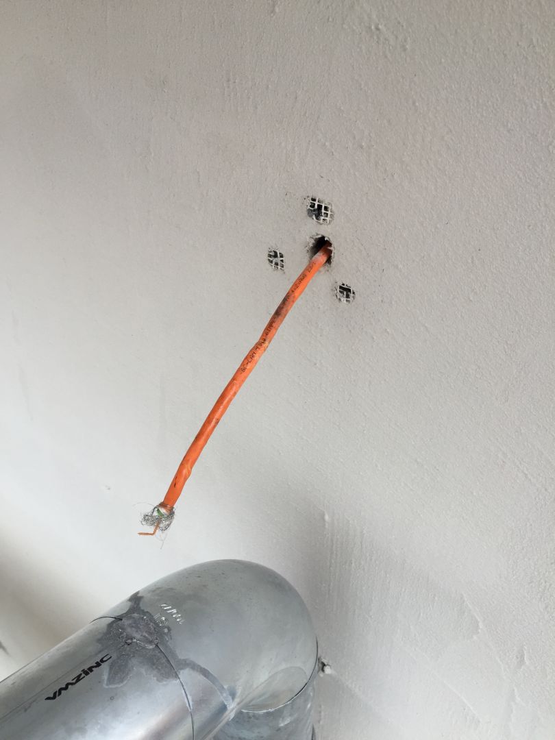 Diese Buchse wird an dem dann gekürzten orangenen Kabel montiert und mein Vorschlag wäre es z.B., diese Buchse in der Wand zu verarbeiten. Also Putz rund um das orangene Kabel entfernen und ausschaben damit es ca. 3-4 cm in der Wand liegt. Vielleicht kann man dafür auch eine Art Hohlraumdose nutzen um es sauber abzuschließen. Zu beachten ist das hinter dem Putz kein Stein sondern eine Dämmung liegt. Das ganze dann mit Baumschaum wieder abdichten und Putz drauf. Die Kamera sollte sich dann wieder in den Bauschaum mit entsprechenden Dübeln anschrauben lassen. Der Feinputz kommt dann erst in ca. 2 Wochen drauf.