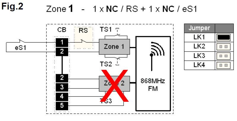 Wenn du das so verdrahtet hast, wie in dem Bild dargestellt (also eS1 als Passiver Melder), dann dürfte das richtig sein. Ist die Drahtbrücke entfernt worden? Sind die Jumper alle richtig gesetzt? Hast du mal einen Test mit dem Öffnungsmelder gemacht? Wie ist das Ding auf die Scheibe geklebt? |