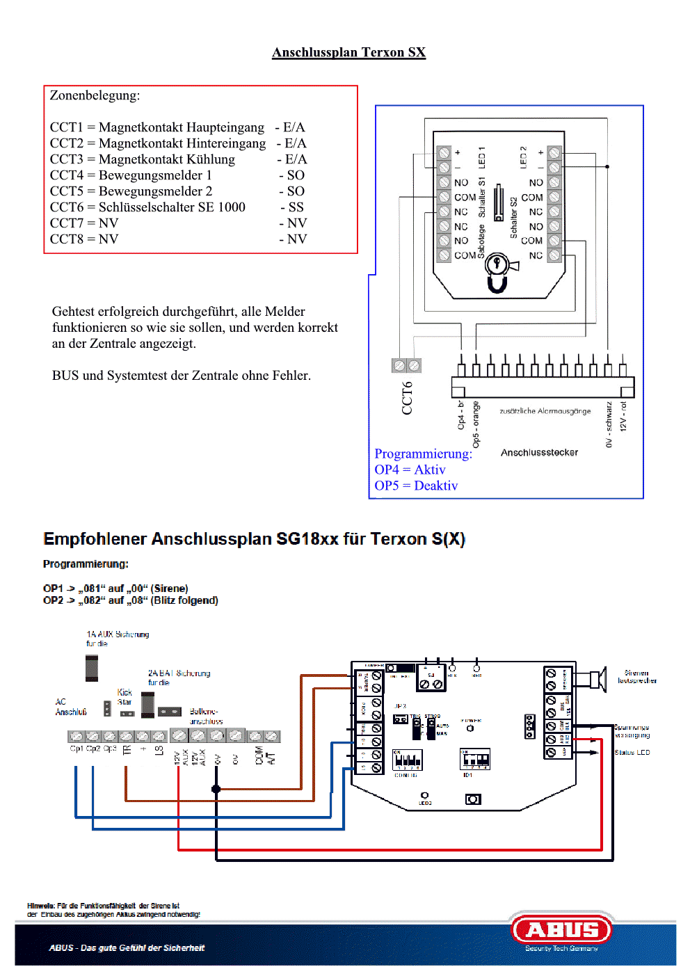 habe die letzten 2 Tage die Alarmanlage Terxon SX mit 3 Magnetkontakten, 2 Bewegungsmeldern, Außensirene SG1800 und dem Schlüsselschalter SE1000 installiert. Es funktioniert fast alles nur der Schlüsselschalter nicht. Wenn ich alle Zonen schließe und den Schlüssel auf SCHARF oder UNSCHARF drehe passiert nichts, lasse ich eine Zone geöffnet und drehe den Schlüssel fängt das Bedienteil an zu Piepen und meldet in meinem Fall das "Zone 01: Haupteingang" geöffnet ist. Habe die Verkabelung schon 3x überprüft und das Handbuch gefühlte 20 mal durchgelesen und finde den Fehler einfach nicht. Ich hoffe Ihr könnt mir weiterhelfen. Hier noch der Anschlussplan Gruß Herbert EDIT: mir ist gerade eingefallen das ich den Schlüsselschalter noch nicht an die Sabotagelinie angeschlossen habe (auch keine Brücke am Schalter eingesetzt), kann es daran liegen das er nicht funktioniert ??? |