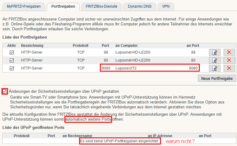 Was mich wundert, ist, dass nicht automatisch eine Portfreigabe über UpNP erfolgt. Dies habe ich sowohl in der FB als auch in der Lupusec so eingestellt.
