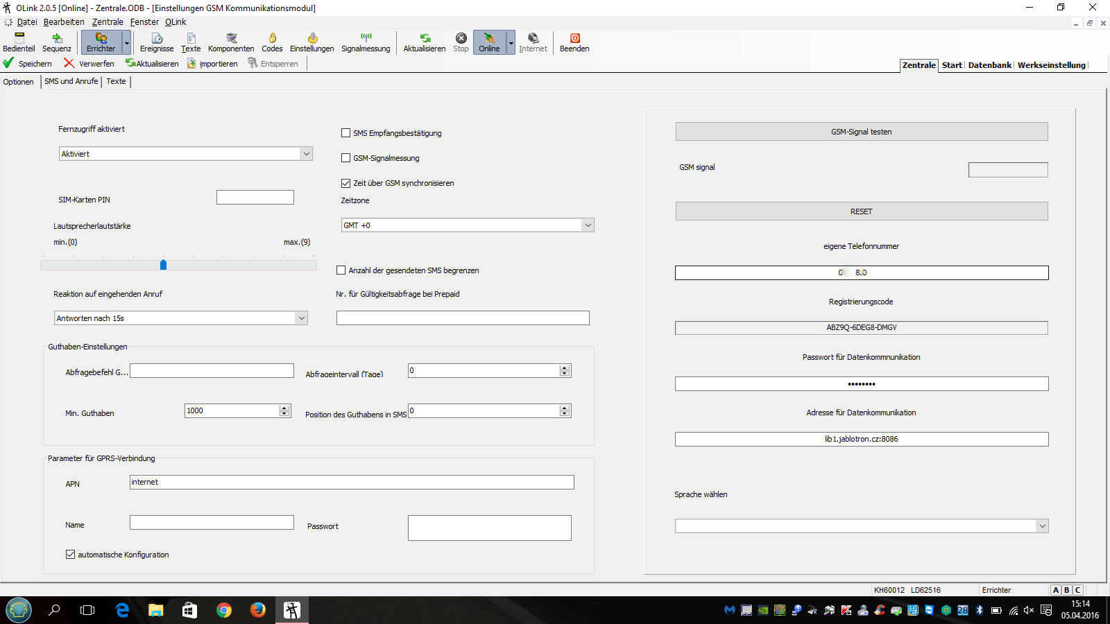Also so verkehrt sehen die Einstellungen nicht aus. Ich würde halt die Reaktion rausnehmen, die Du auf gesamtes System stehen hast. So schärft die Anlage bei jedem Anruf alles. Also ich habe nochmal nachgesehen. Meine Nummer habe ich 0049172.... eingegeben. Das funktioniert. Aber ganz normal mit zb. 0172.... oder +49172... müsste auch gehen. Die Nummer ist aber korrekt? Also Du hast Sachen! Du kannst: Das GSM Modul reseten über Olink. Dann sind aber die Texte der Komponenten weg. Die lassen sich wieder einspielen, habe ich schonmal gemacht, weiß aber ehrlich gesagt nicht mehr wie. Da Du nicht viele Komponenten hast, wäre das schon machbar. Rufe mal in Olink nochmals die GSM Modul Einstellungen auf, bei mir bleibt manchmal auch irgendwie das Sprache Feld leer. Wenn ich dann warte, es neu öffne oder aktualisiere ist es aber wieder da. Wenn Du die Sprache änderst sind auch alle Texte futsch. Tut mir leid ich finde den Fehler wirklich nicht. Aber es hatte doch schonmal funktioniert, oder. Den Haken bei automatischer Konfiguration der GPRS Daten würde ich rausnehmen und das einmal händisch machen. Ist besser. Ich denke nochmals drauf rum. Vieleicht hat ja jemand anderes noch ne Idee? |