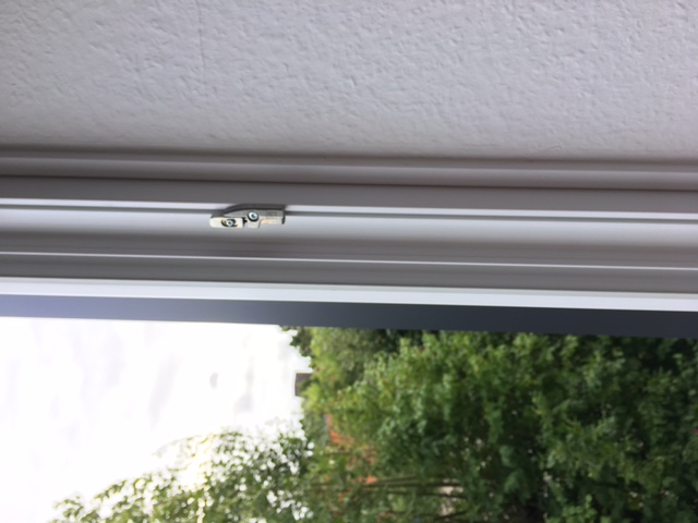 So etwa an einer meiner Terrassentüren. Ich habe nur 2 statt 4 Schrauben verwendet und habe auch nur in den Doppelsteg geschraubt, nicht ins Metall. Die Sabo-Kontakte habe ich vorsichtshalber ausgeschaltet.