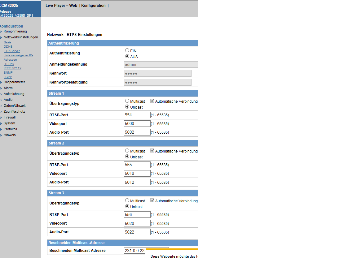 Als Betriebssystem wird Windows 7 verwendet. Wurde bereits auf mehreren PCs mit unterschiedlichen Browsern (Firefox, Internet Explorer) getestet allerdings ohne Erfolg... Irgendwie will es nicht klappen des Stream ohne Passworteingabe aufzurufen... Wollte den Stream eigentlich ins Internet übertragen (mit Portweiterleitung über Router), allerdings funktioniert das nicht, wenn es jetzt schon Intern nicht mal funktioniert... lg Xaver |