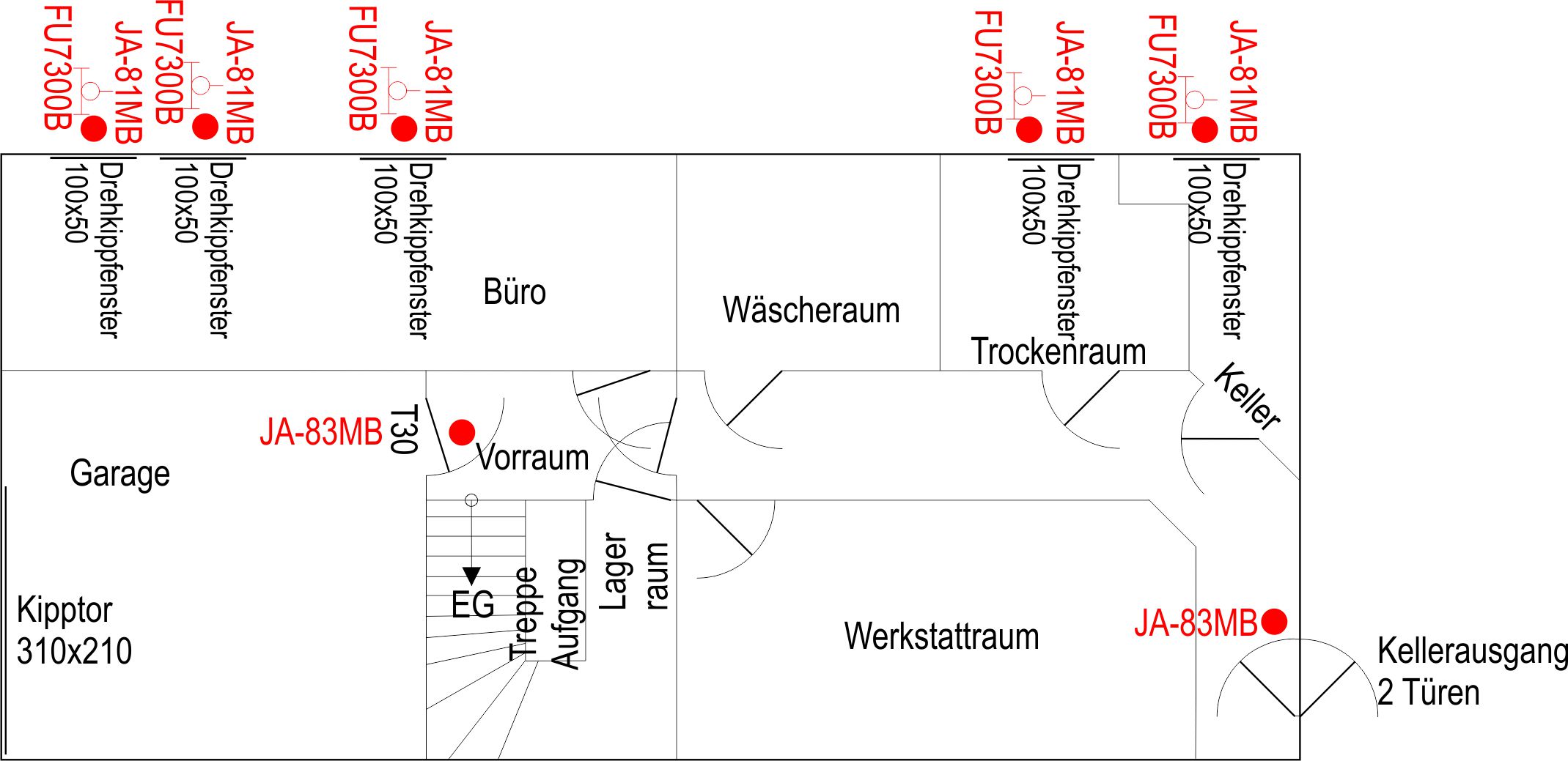 1 Zentrale JA-83K 1 GSM-Modul JA-82Y 1 Funkmodul JA-82R 2 Handsender RC-86 1 Bedienteil verdr. JA-81E-RGB 9 Magnetk mit Eingang JA-81MB 21 Glasbruchmelder FU7300B 12 Magnetkontakt JA-83MB 1 BWM PIR+MW JA-80W 1 drahtgeb. Außensirene OS365A 1 Komm-Modul JA-80V 1 Innensirene Funk JA-80L 1 Innensirene SAG-122 1 Bedienteil Funk JA-81F-RGB 1 Akku SA-214-18 1 PC-Kabel JA-82T teilscharf ist nur Außenhaut+Glasbruch vollscharf (sagt man so?) Außenhaut+Glasbruch+BWM Alarmierung über GSM, Zweitweg IP (theoretisch noch Drittweg über Festnetz möglich) IP-Router und JA-83K sind zusätzlich noch an einer USV 700VA Die neuesten Zeichnungen habe ich jetzt auch noch beigefügt. |