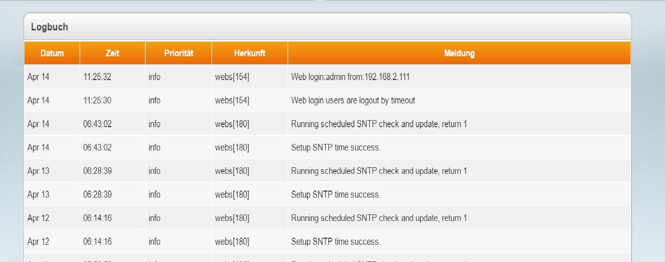 Der erste Eintrag ist eine Login als Admin von einer lokalen Ip. Da hat sich jemand (ich hoffe du selber) mit admin eingelogged und ein Timeout hat dann die Session geschlossen. Der Vorgang ist also normal, außer du weißt, dass sich niemand am 14.4 um 11:25 eingelogged haben kann bzw. du es nicht selber warst. 192.168.2.111 müsste dann die Ip deines Rechners sein. Die restlichen Einträge sind Zeitaktualisierungen dafür steht SNTP und die sind jedes Mal erfolgreich. Auch das ist völlig OK und kein Grund zur Panik. Gruß Christian. Murphys Law: Man hat niemals Zeit, es richtig zu machen, aber immer Zeit, es noch einmal zu machen. |
