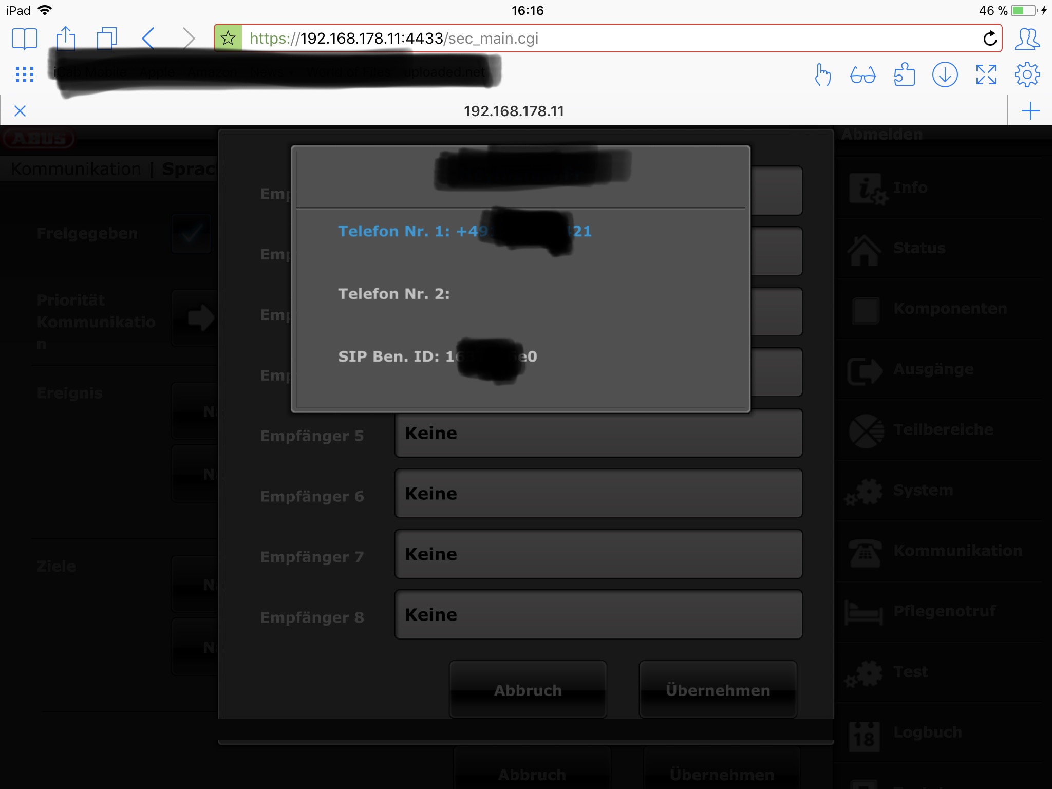 habe gestern die neue Software aufgespiel(2.01.08)....hate noch 1.1 drauf. Auch hier nach dem Tipp aus dem Forum, hat der Sip Testanruf nach Kaltstart der Alarmanlage funktioniert. Kommunikation Kontakte: Empfänger 1 Telefon Nr.1 +49175XXXXXXXX Telefon Nr.2 leer Email: meine Emailadresse IP Adresse: leer SIP Ben.ID: +49175XXXXXXX (die Nummer die angerufen werden soll). Kommunikation/Sprachwahlgerät Dort habe ich bei freigegeben ein Häkchen gesetzt. Prioriät Ethernet 1 PSTN Nein. Klappt leider nicht. Hoffe auf weitere Hilfe. Danke |
