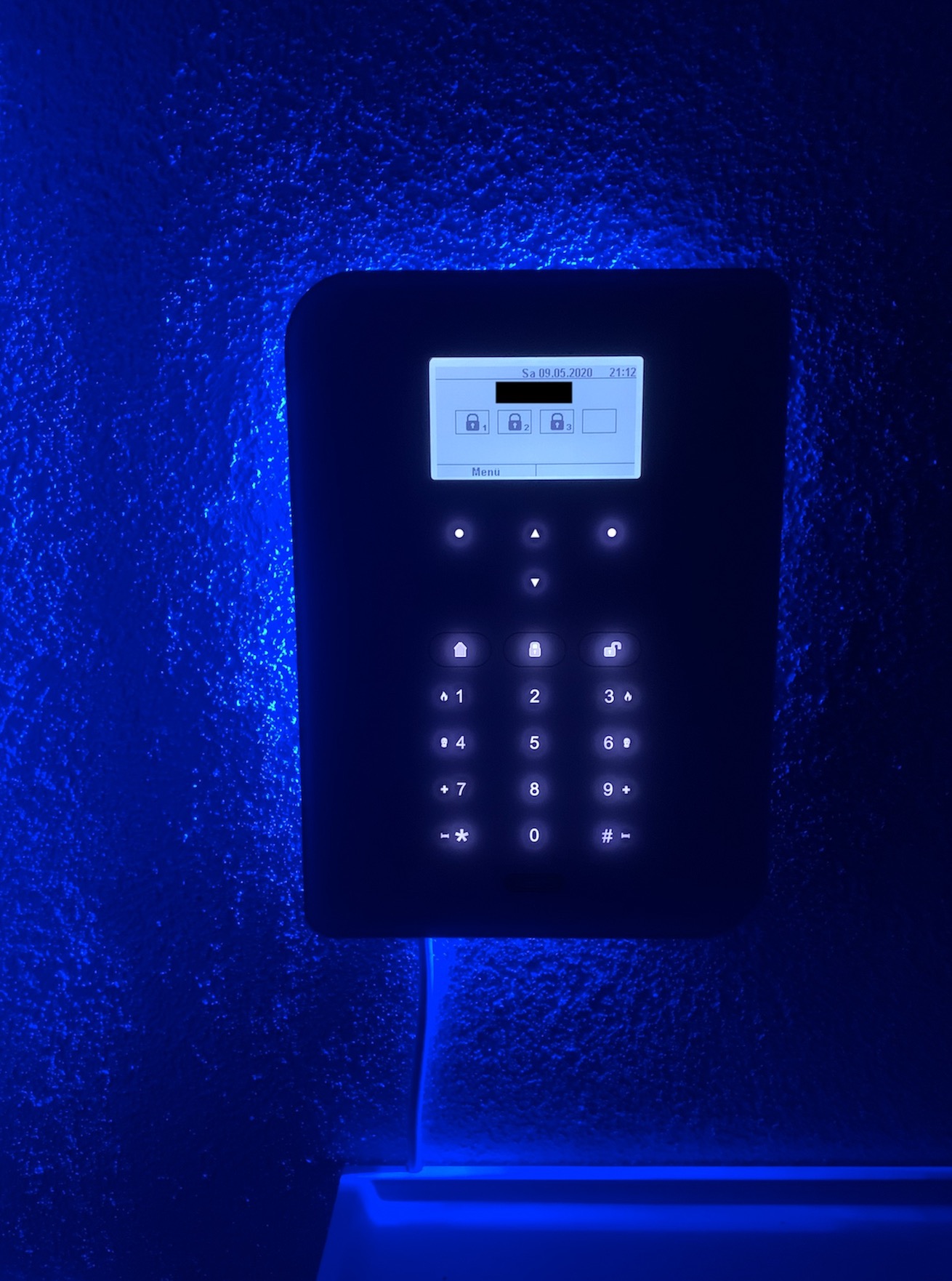 Die Montage ist anhand der genannten Beschreibung sehr einfach. Ich habe im System den Ausgang 301 nach meinem Bedürfnis nach „aktiv“ konfiguriert. Die LED-Strips (zwei 16,8cm 12V Farbe blau) habe ich dabei an die Rückseite der Montageplatte angeklebt. Damit leuchten die LEDs die Wand an, womit ein schöner Aura-Effekt rund um die Zentrale entsteht. Die Fehlalarme wegen nicht erkennen, ob die Anlage scharf ist, sollten damit der Vergangenheit angehören Smile