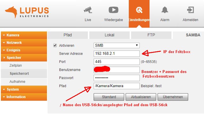 (26-01-2020 11:59)dantex12 schrieb: Hy, Hallo Dantex12, da ich seit dem letzten Firmware-Update Probleme mit FTP-Speicherung auf der Fritzbox hatte, habe ich die Speicherung vor 3 Tagen auf SMB umgestellt. Seitdem sind bei mir auch keine "MP4" Dateien mehr aufgetaucht, die nicht mehr vernünftig gespeichert waren (.MP4_). In der aktuellen Firmware für die LE 201/202 scheint ein Bug zu sein. Mit FTP hatte ich, wenn die Kameras über Nacht eingeschaltet waren, hunderte von Anmeldeversuche auf der Fritzbox (Protokoll). Habe es an Lupusec gemeldet und es soll untersucht werden. Einfach SMB in der Fritzbox freischalten und in den Kameras die Zugangsdaten eingeben. Funktioniert bisher einwandfrei. Gruß Hano |