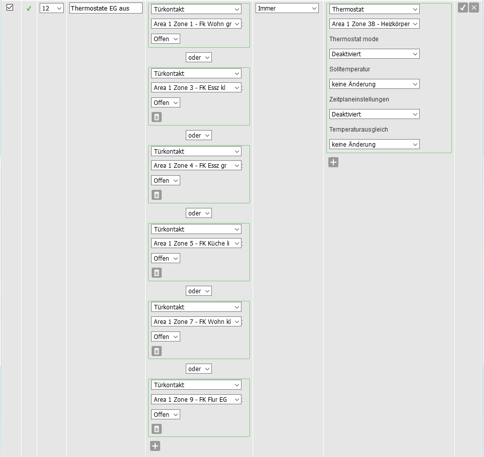 Zeitplan habe ich beim Thermostat hinterlegt und immer wenn ein Fenster z.B. im EG aufgeht, dann sollen dort die Heizkörper ausgehen. Rechts kann man dann alle betroffenen Thermostate aufführen und wenn die Fenster zu sind gehen die Thermostate automatisch wieder in ihren Zeitplan.