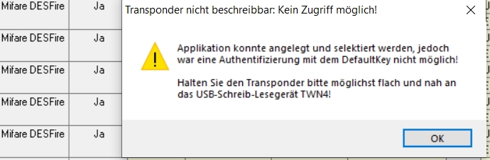 Ich bekomme mit dem Lesegerät die angezeigte Fehlermeldung. Ich habe zwei verschiedene Transponder probiert, Mifare Desfire EV1 2K und 4K. Was mache ich falsch?