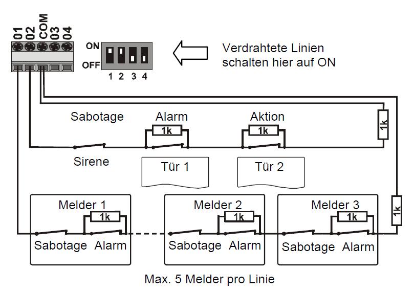 Bei Magnetkontakten nehme ich normalerweise pro Zimmer eine Linie und verdrahte in EOL (Z-Verdrahtung). In Neubau möchte der Kunde oft die Dosen zugeputzt haben, daher habe ich bei den Magnetkontakten keine separate Sabotogelinie für die Deckelkontakte. Bleiben die Deckel aber sichtbar, kann ich mit 2 Adern und DEOL die MK und die Deckelkontakte auswerten. In einem EFH sind es meistens nur wenige Fenster pro Zimmer, da funktioniert das so. Es ist nicht meine favorisierte Art der Verkabelung, aber manchmal sind die Leitungen schon verlegt, und der Elektriker hat nur einen Ring pro Etage vorgesehen...