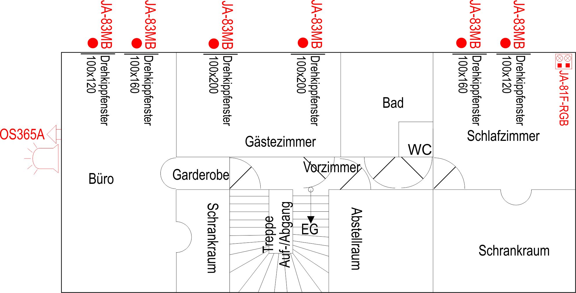 1 Zentrale JA-83K 1 GSM-Modul JA-82Y 1 Funkmodul JA-82R 2 Handsender RC-86 1 Bedienteil verdr. JA-81E-RGB 9 Magnetk mit Eingang JA-81MB 21 Glasbruchmelder FU7300B 12 Magnetkontakt JA-83MB 1 BWM PIR+MW JA-80W 1 drahtgeb. Außensirene OS365A 1 Komm-Modul JA-80V 1 Innensirene Funk JA-80L 1 Innensirene SAG-122 1 Bedienteil Funk JA-81F-RGB 1 Akku SA-214-18 1 PC-Kabel JA-82T teilscharf ist nur Außenhaut+Glasbruch vollscharf (sagt man so?) Außenhaut+Glasbruch+BWM Alarmierung über GSM, Zweitweg IP (theoretisch noch Drittweg über Festnetz möglich) IP-Router und JA-83K sind zusätzlich noch an einer USV 700VA Die neuesten Zeichnungen habe ich jetzt auch noch beigefügt. |
