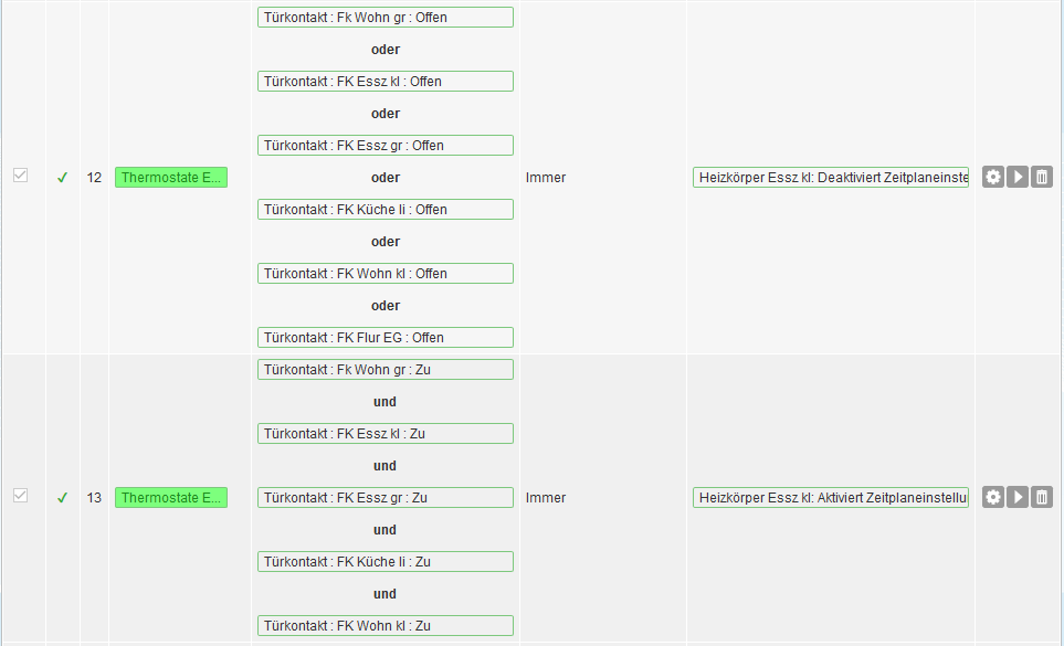 Zeitplan habe ich beim Thermostat hinterlegt und immer wenn ein Fenster z.B. im EG aufgeht, dann sollen dort die Heizkörper ausgehen. Rechts kann man dann alle betroffenen Thermostate aufführen und wenn die Fenster zu sind gehen die Thermostate automatisch wieder in ihren Zeitplan.