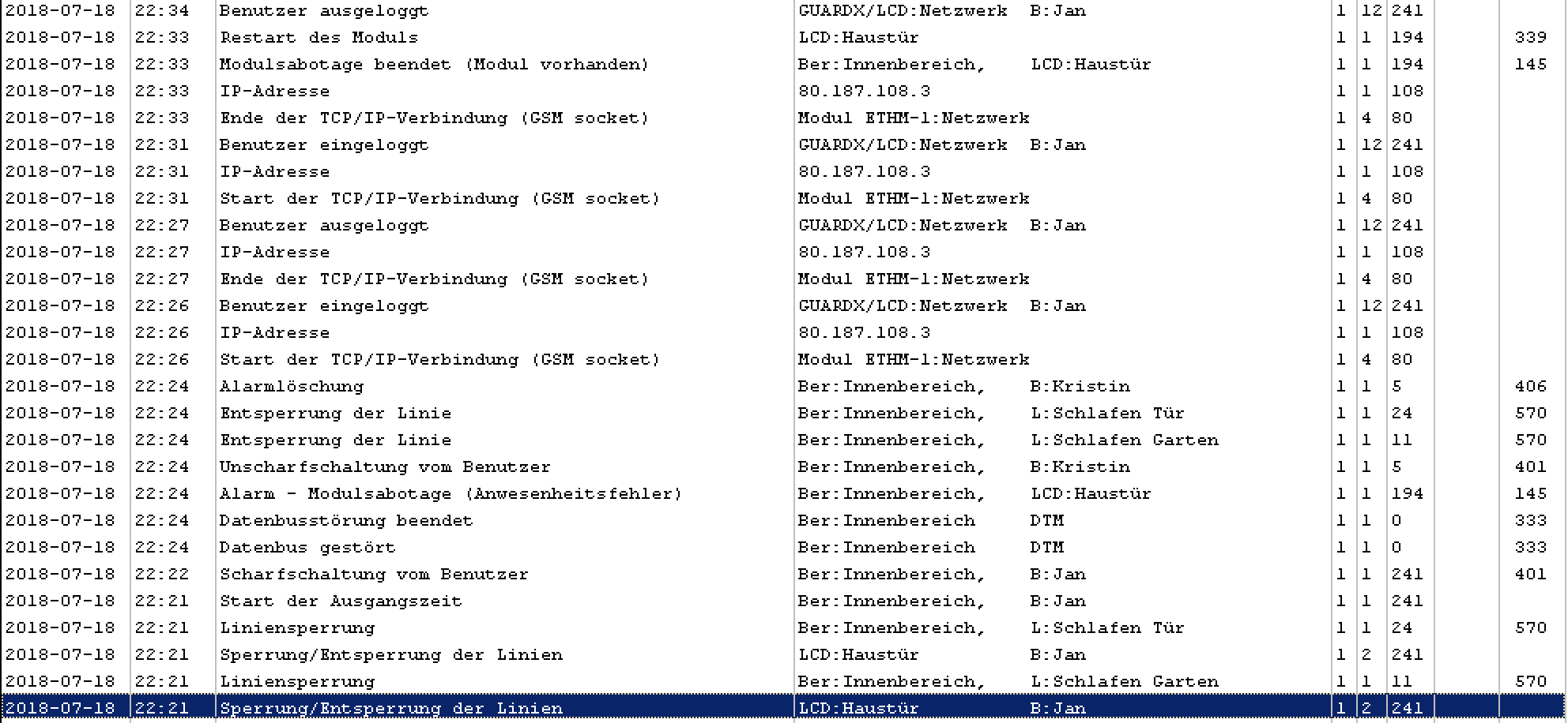 ich habe in meinem EFH eine Satel Integra 64 Plus selbst installiert, abgesehen von kleineren Konfigurationsthemen und selbst ausgelösten "Testalarmen" gab es bis dato keinen Fehlalarm oder dergleichen. Hier aber erst mal meine Konfig: Satel Integra 64 Plus, v. 1.12 Bedienteil 1 im Hausw.-Raum: INT-KLCD, v. 2.12 Bedienteil 2 an der Haustür: INT-TSG, v. 1.02 Vor ca. 8 Wochen hat das System morgens, nachdem ich das Haus Richtung Arbeit verlassen habe, einen Alarm ausgelöst: Sabotagealarm am INT-TSG. Ganz sicher hat in diesem Moment keiner das TSG sabotiert, für mich kommt ggf. als Lösung in Frage, dass ja hinter dem Gerät ein photosensitiver Sensor sitzt, dass dieser LIcht abbekommen hat. Ich habe noch einmal Acryl drum geschmiert um sicherzugehen, dass da kein Licht drankommt. Nun war ca. 8 Wochen Ruhe - bis gestern Abend: Meine Frau hat über das INT-TSG-Makro die „Gute-Nacht-Schaltung“ aktiviert und kam dann hoch ins Bad. Plötzlich hörten wir einen langen Piepton (interner Alarm) und kurz darauf ging auch schon das Innen-Sirenen-Inferno los. Bin dann zur Haustür um auf dem TSG nachzuschauen welche Linie ausgelöst hat bzw. Was genau vorgefallen ist und was sehe ich: Alle Symbole leuchten, der Schirm ist schwarz und dort steht: „No valid File! No valid Flash! Get the right File!“ Ich konnte mit dem daneben angebrachten INT-CR erst einmal den Alarm ausschalten. Dann wurde es mir aber auch klar: Das INT-TSG hat sich abgemeldet und dadurch ist ein Alarm ausgelöst worden. Ich habe zwei Bilder angehängt, einmal die Auswertung aus DLOADX und einmal das Bild des INT-TSG direkt nach dem Alarm. Das INT-TSG scheint sich nach einigen Minuten selbst „geheilt“ zu haben. Dieses Verhalten ist mir bis dato nur einmal aufgefallen: Als ich vor einigen Monaten einmal ein Makro für das INT-TSG geändert habe, kam genau dieselbe Meldung. Ich musste dann noch einmal flashen und die Meldung war weg. A) Ist das Verhalten bekannt bzw. Hat hier jemand eine Ahnung, was da los sein könnte? B) Da ich noch auf v. 1.02 bin: Gibt es ein Changelog für die Firmware? Auf der Seite von Satel habe ich leider nichts finden können C) Update der Firmware der Alarmanlage: Muss ich diese danach komplett neu parametrieren, also wird sie dadurch in den Werkzustand versetzt? Dachte mir, mal auf neue Versionen zu updaten kann nicht schaden. Danke schon einmal für Eure Hilfe! Jan |